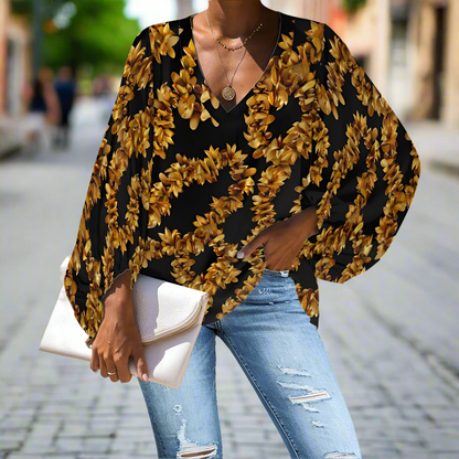 Golden Blossom Boho Chic Blouse – Casual and Dressy Women’s Floral Top V-Neck Chiffon Puff Sleeve Blouse by Luxtrini