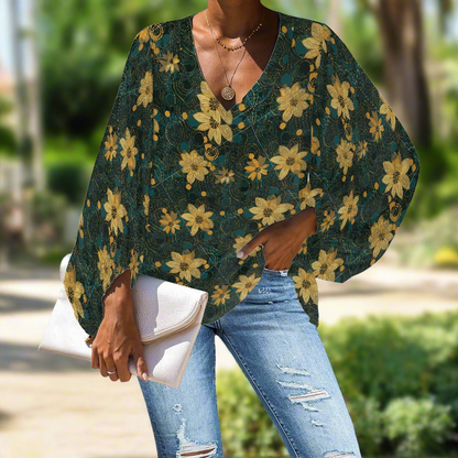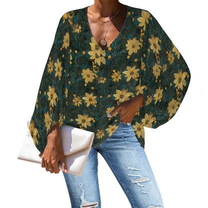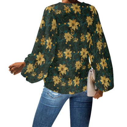 Floral V-Neck Puff Sleeve Chiffon Blouse