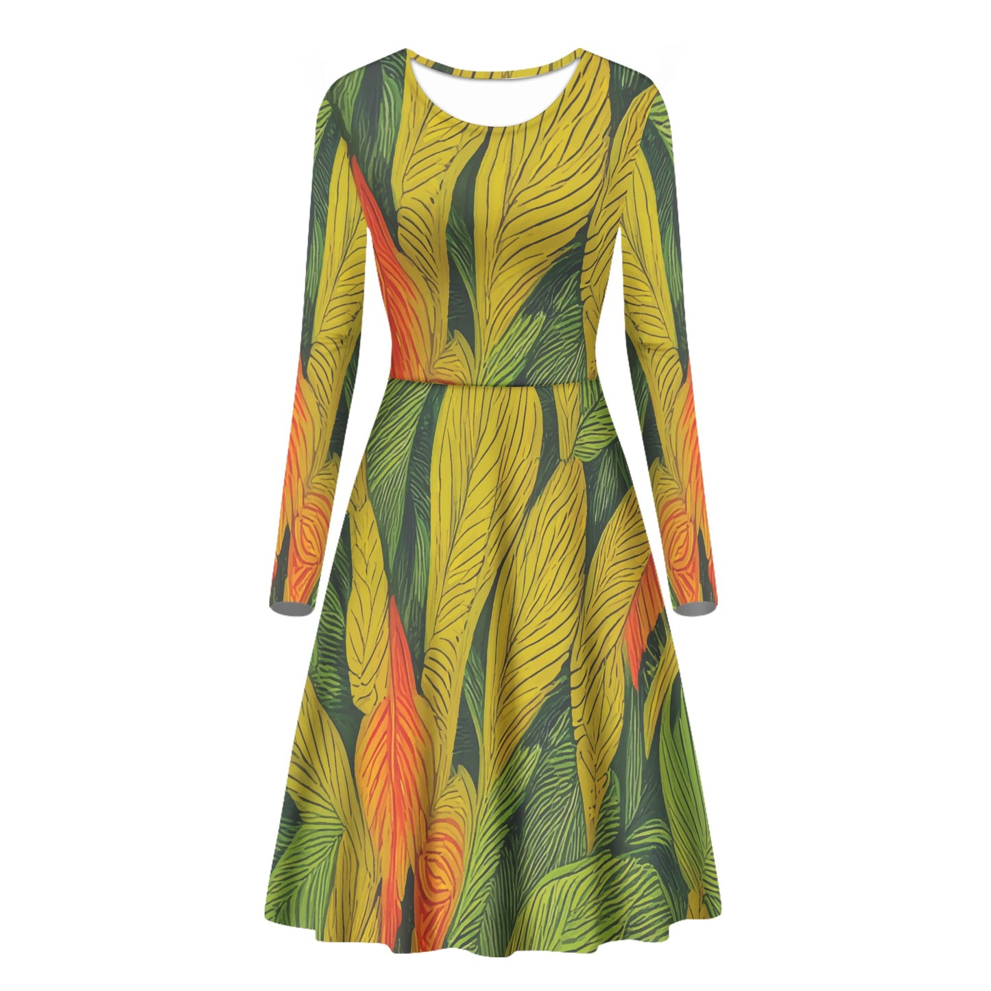 Green, Yellow, orange Leaves Long Sleeve Scoop Neck Ruffle Dress - Women's Custom Dress