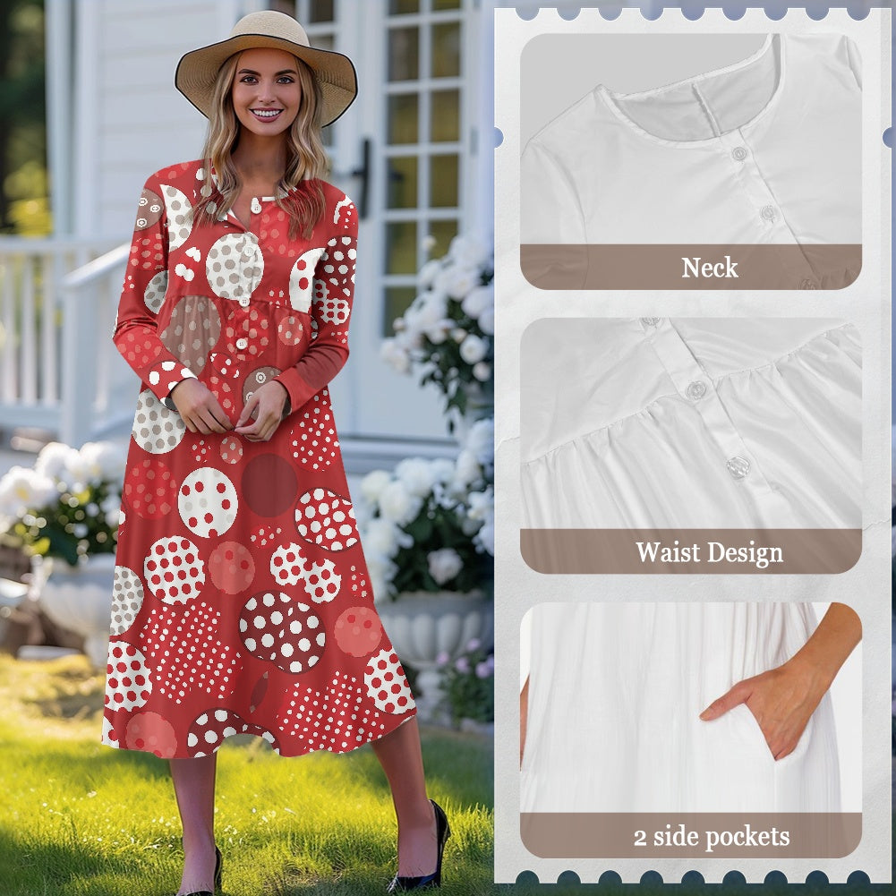 Luxtrini Ladies V-neck button dress Boho Polka Dot Midi Dress with Pockets – Retro Red