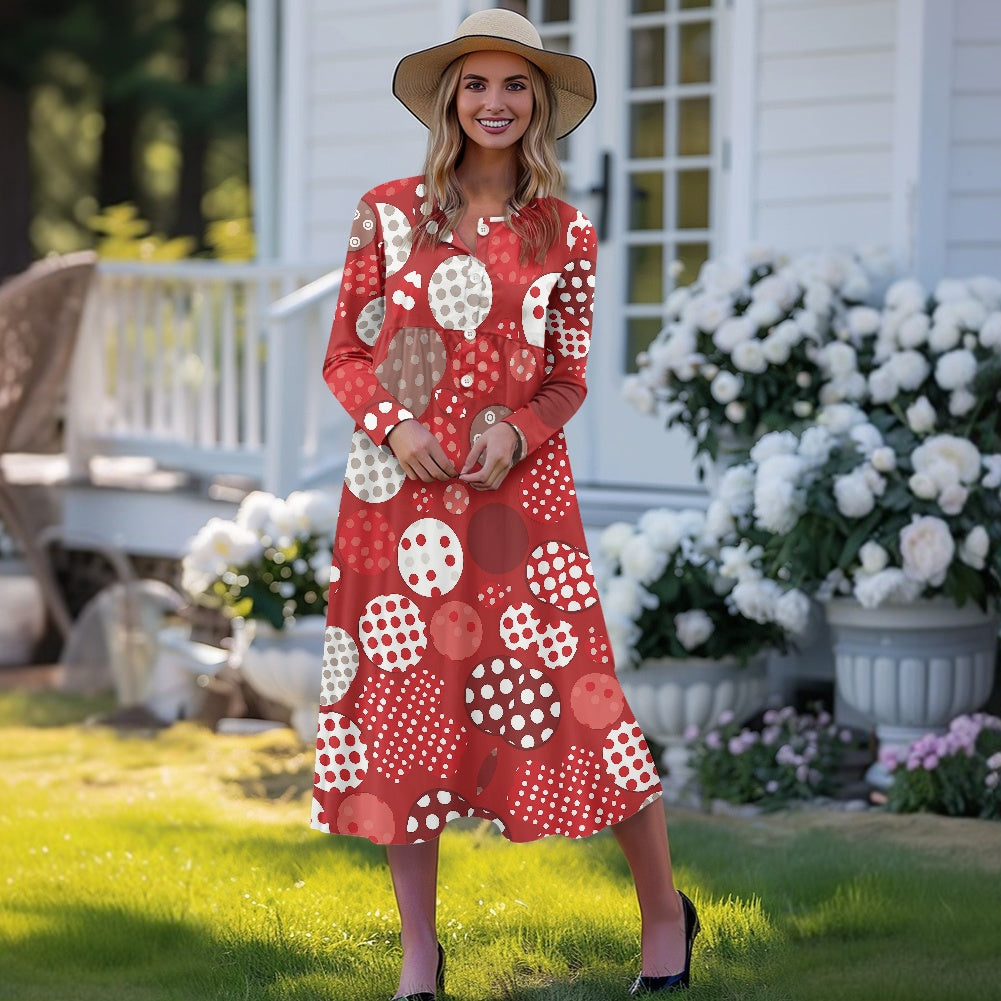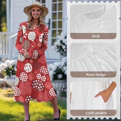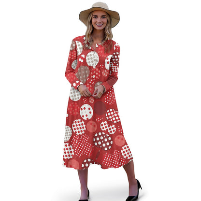 Elevate your wardrobe with Luxtrini’s eco-friendly Boho Polka Dot Midi Dress in Retro Red! This handmade piece is crafted from breathable, sustainable fabric, designed to offer both elegance and comfort. Its playful polka dot pattern in varying shades of red and cream brings a touch of vintage charm, while the A-line silhouette and empire waist create a flattering fit for any body type. With long sleeves and functional side pockets, this dress is perfect for both casual outings and semi-formal gatherings, adding a pop of color and style to any setting.