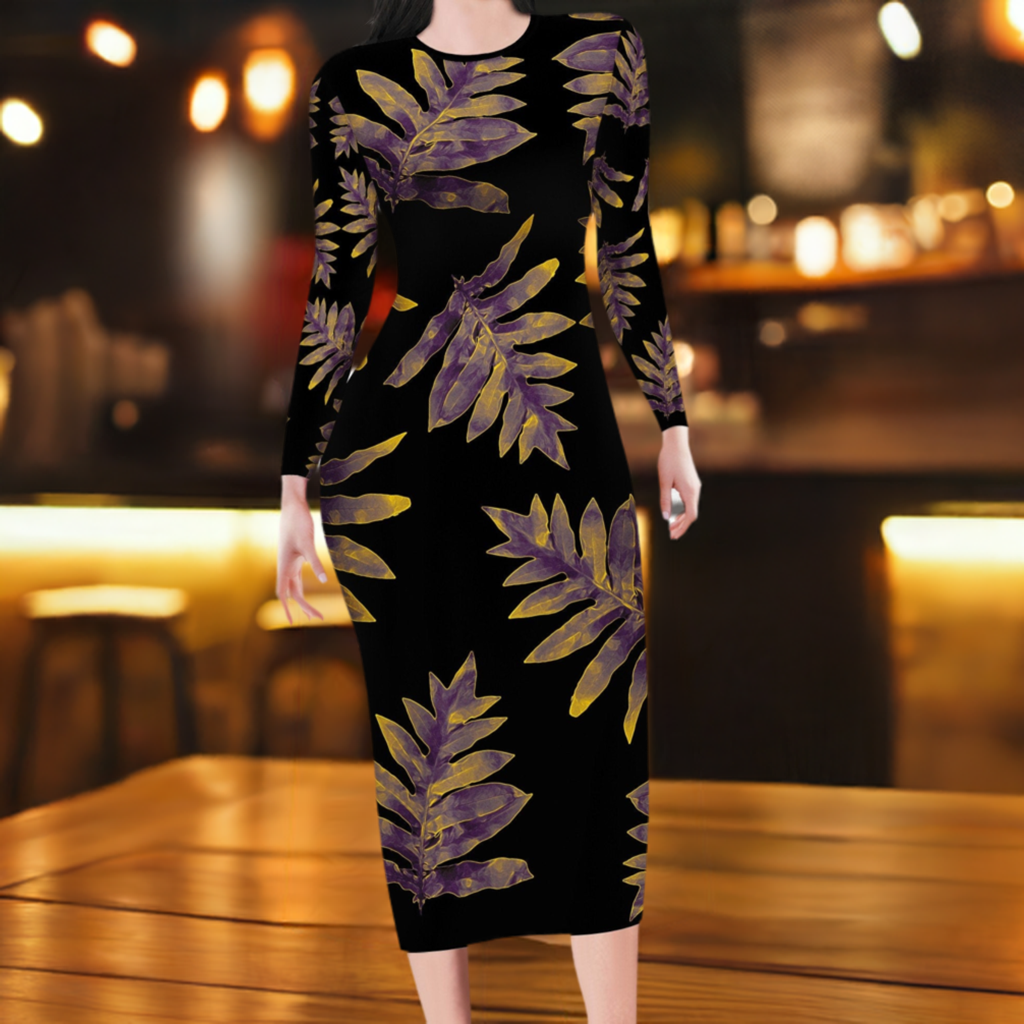 Gold Laua'e Leave on Purple, Women Bodycon Midi Sheath Dress - up to 4XL