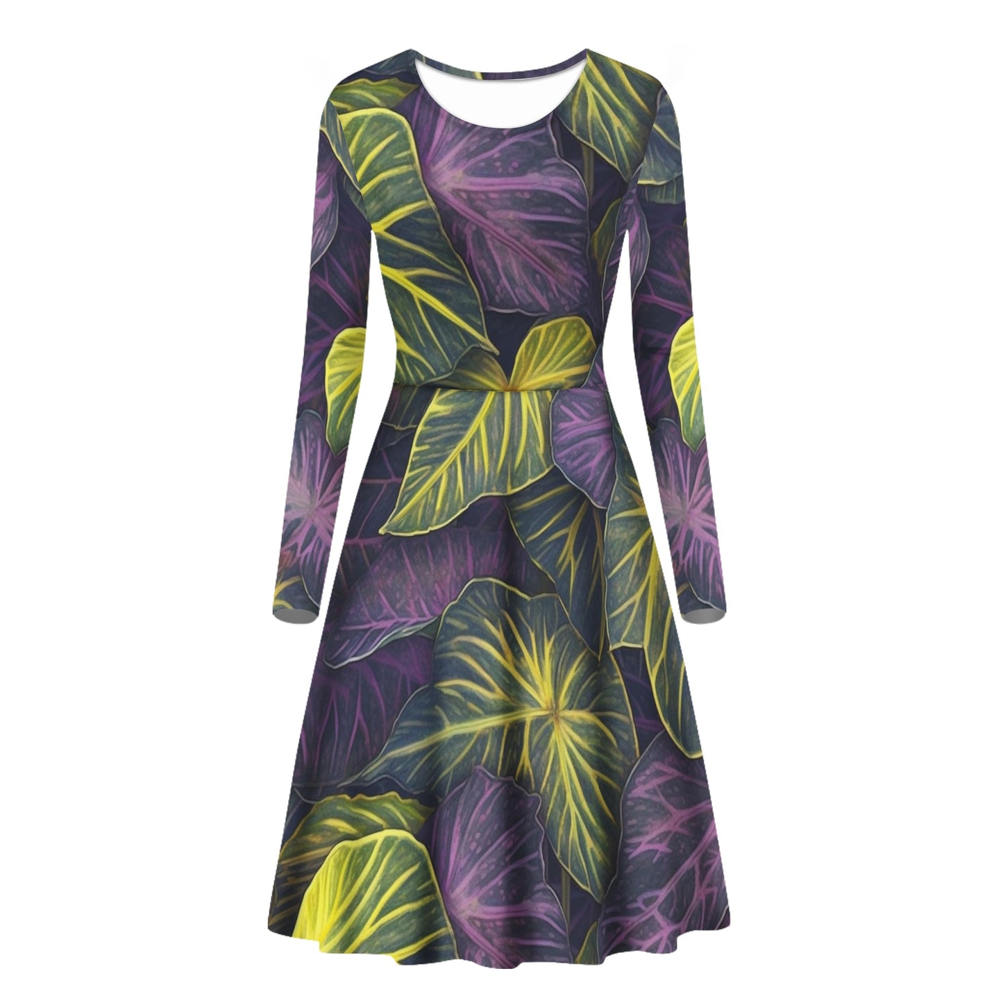 Luxtrini Iridescent Syngonium: Purple and Yellow Women Long Sleeve Ruffle Dress