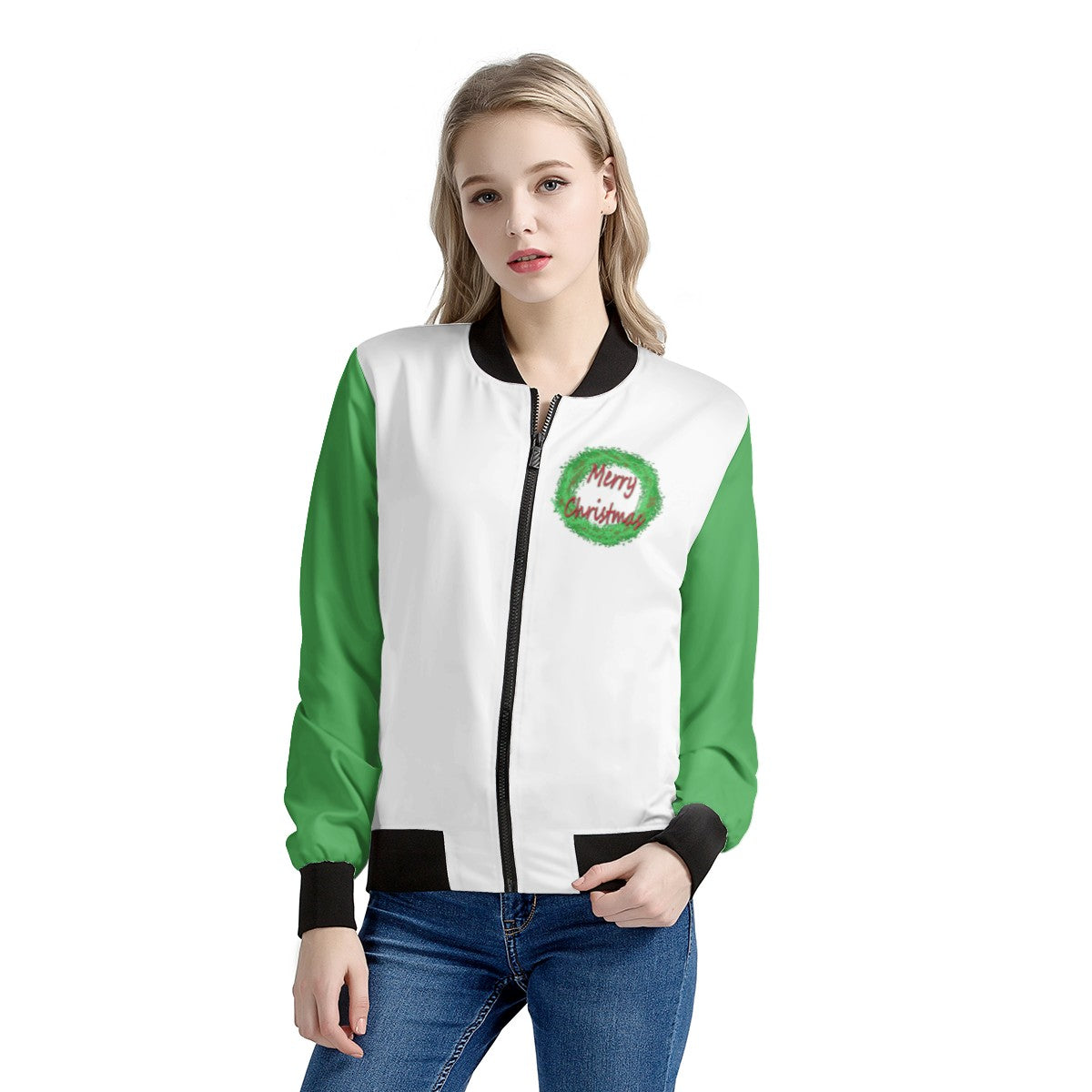 Women’s Christmas Bomber Jacket - Merry Green Accent | Handmade & Ultra-Soft Holiday Fashion