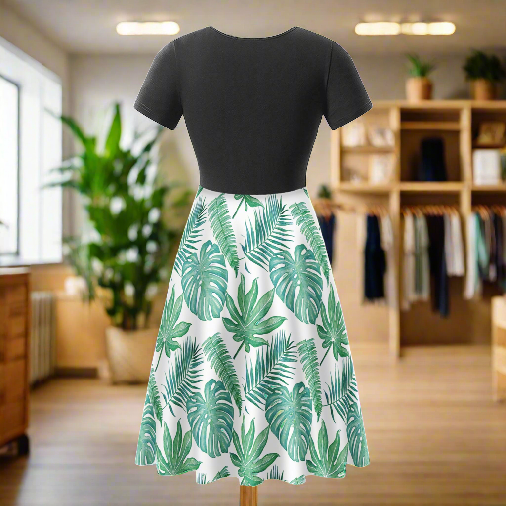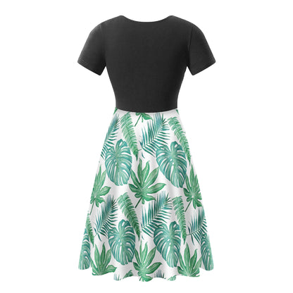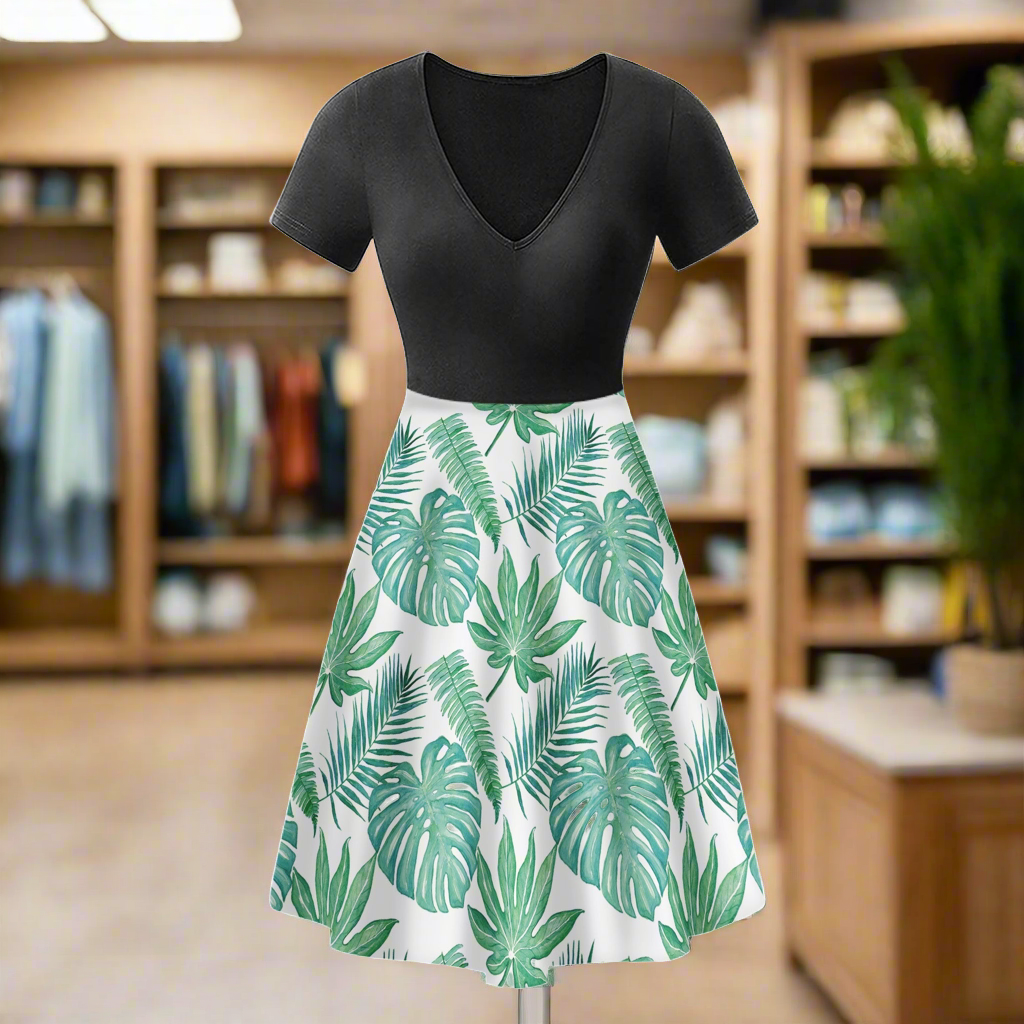 Palm and Monstera Leaf Green V-Neck Black V-Neck Women Ruffle Bottom Dress