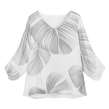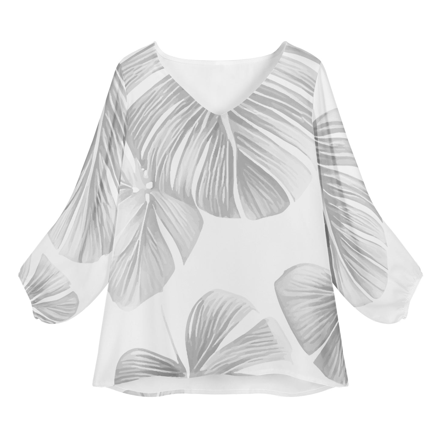 White Monstera Women Long Sleeve Puff Sleeve Blouse