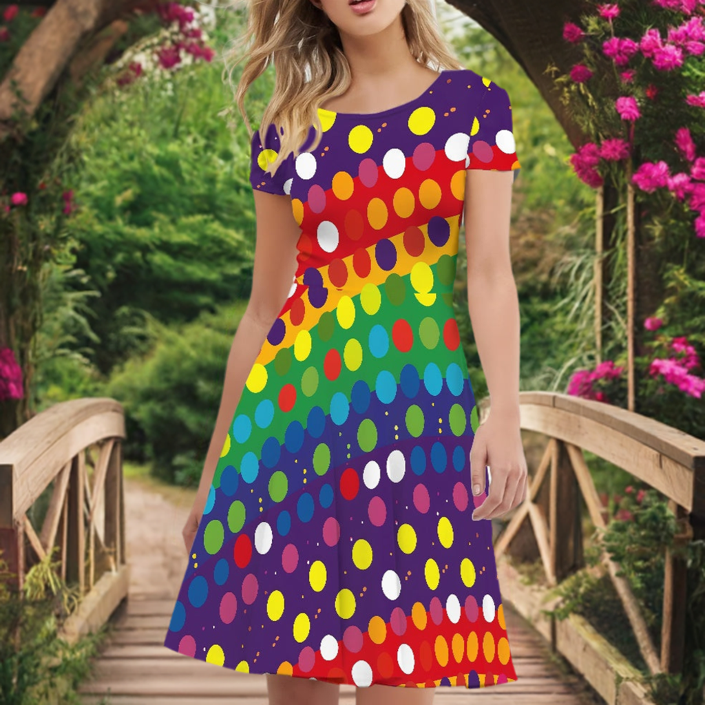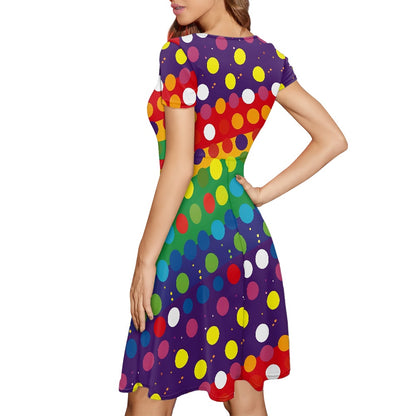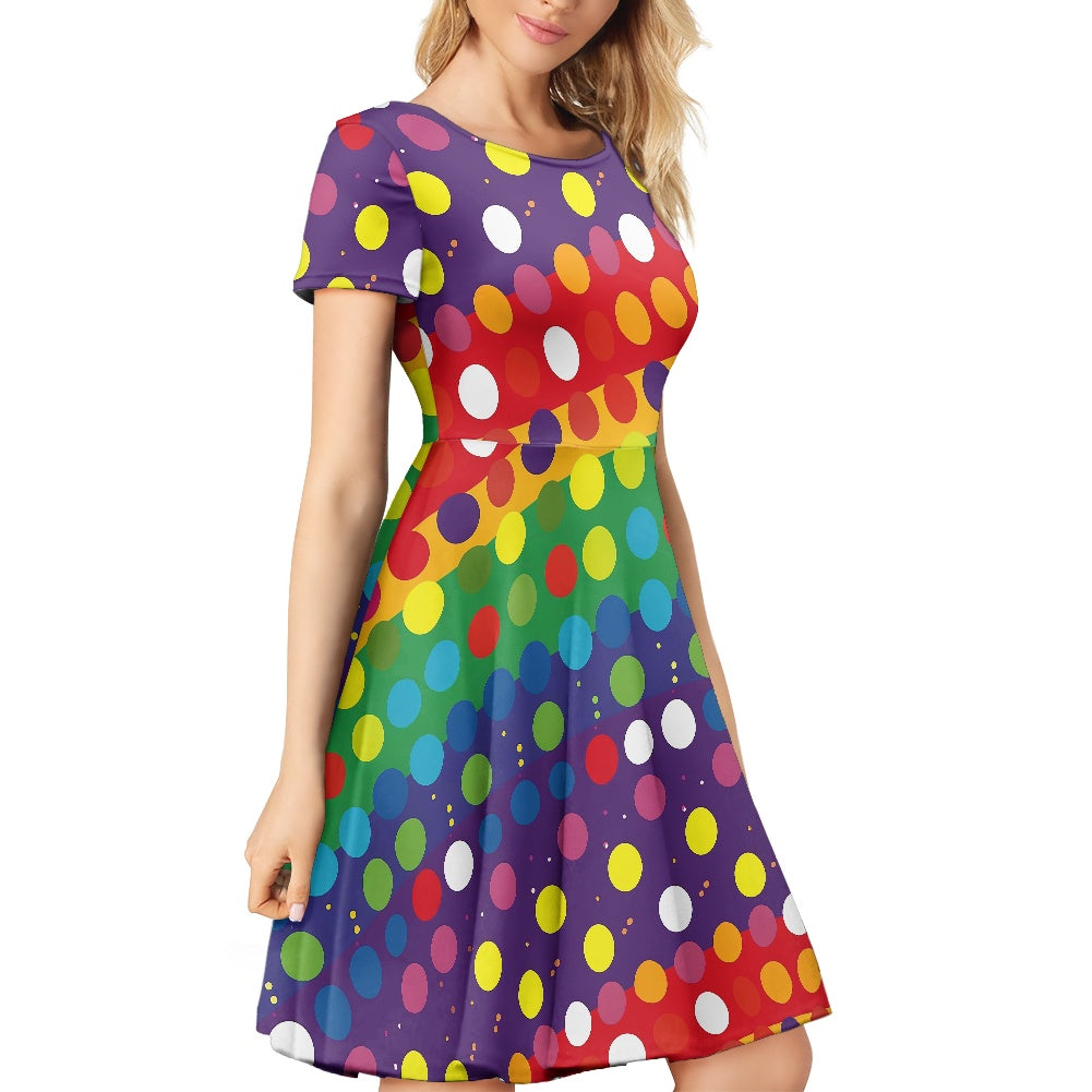 Rainbow Polka Dots Women Scoop Neck Short Sleeve Ruffle Dress